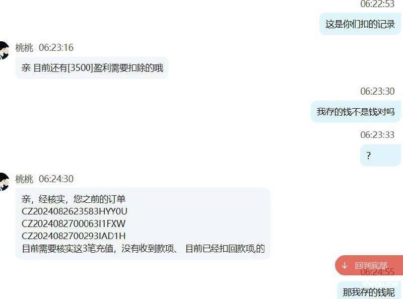 我在b体育因为银行卡问题,充值的3500元被系统冲正。当我打到5000元准备提款时,却迟迟不到账。等了三个多小时后,仍然没有收到款项,于是我联系了客服。结果他们告诉我,卡异常,钱已经退回,但要扣掉我的余额5000元。我同意让他们扣款,但之后再充值100元通过ebpay,打到3340元后,他们却不给我提款,将全部金额扣掉。 他们声称需要核实我的五笔存款,但实际上我根本没有那么多存款。无论账号里有多少钱,他们最终都会扣掉。找客服根本没有用,他们只是重复说需要扣款。最后,我的账户余额只剩下一毛钱。我充值并打到3340元的金额也被扣光了。如果你们有人打算去b体育玩,劝你们三思,因为你迟早会被坑得一干二净。
